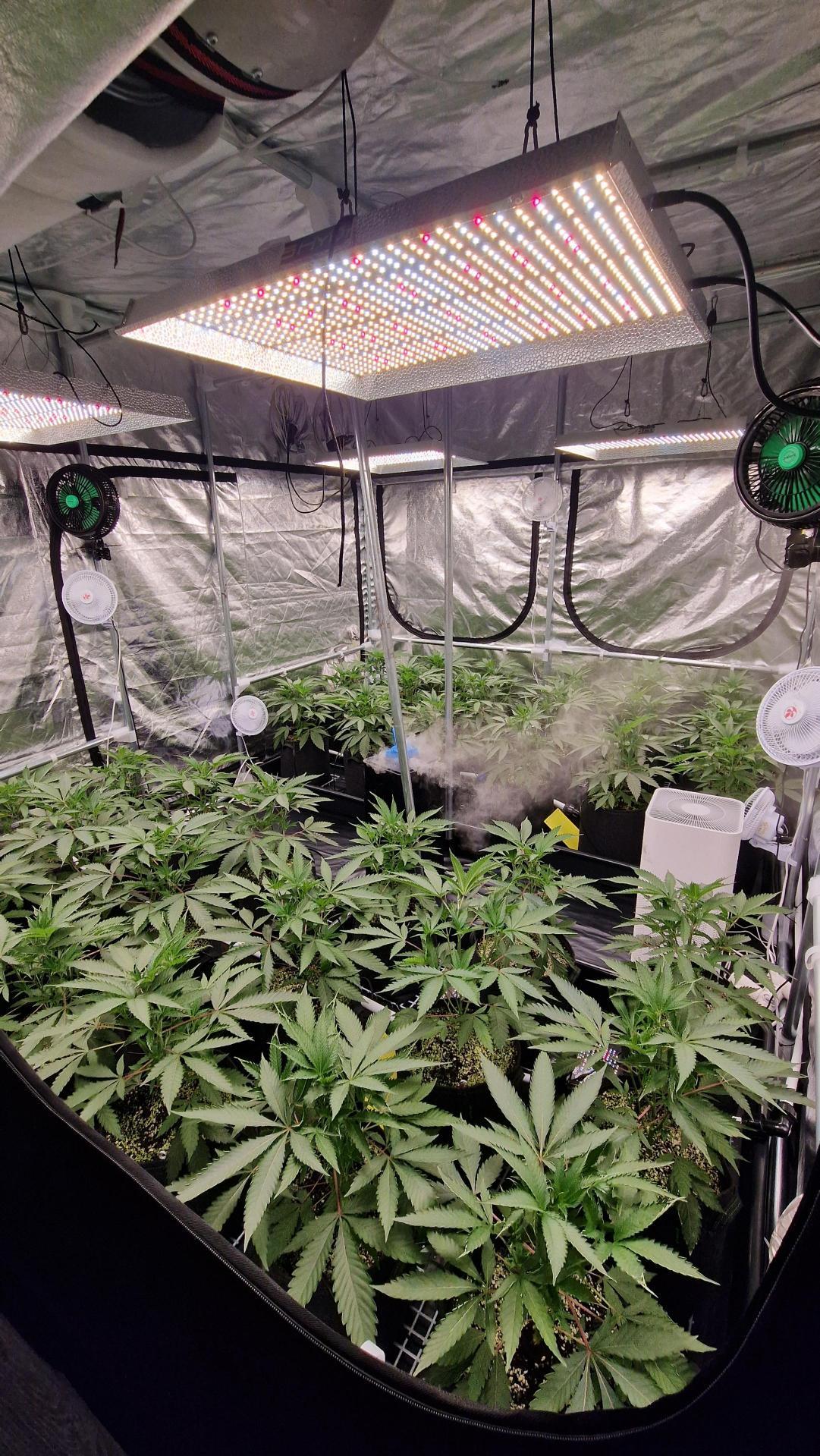 Sealed grow room with a 2.4 × 2.4 m tent inside. The room works like a lung room with AC and dehumidifiers.