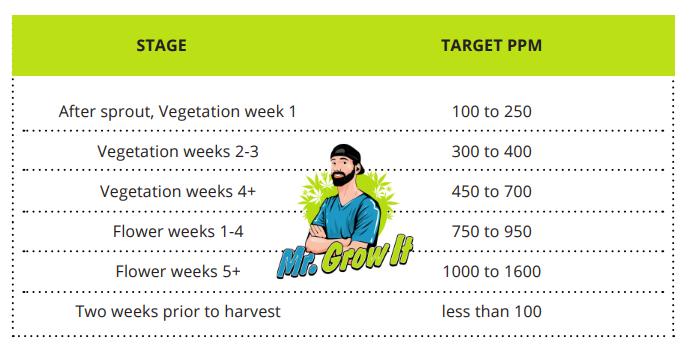 KeymasterHey! Everything looks pretty normal there. I wouldn’t worry if some plants stretch more than others. Yeah they are probably very close to needing a feeding if you put them in those 3gal containers 30 days ago. For the GH flora series, many will start with a 1/2 dose according to the feeding chart; some even start with 1/3 dose to safe side it. After you mix the nutrients into water and water your plant, check the runoff pH and PPM. Below are general ranges to aim for (500 scale TDS tester) for the different stages of growth. That chart is from my book 7 Steps To Grow Cannabis